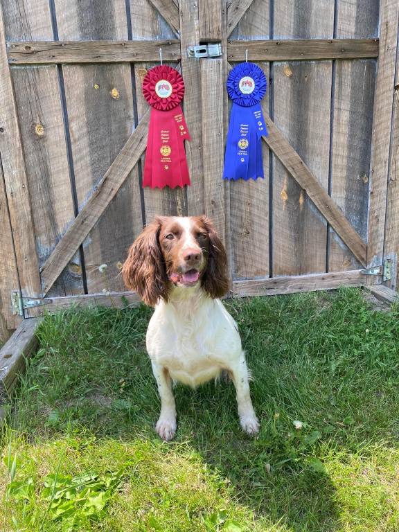 The weekend of May 28th and 29th was well attended by Springers of Narvin dogs in Central Ontario. In the Amateur All Age on Saturday Narvin's SB Baker of Blackbrier (seen in the photo to the right) under Micheal J. Pollock placed 2nd while the Limit Stake saw Narvin's Griffin of Wingfoot under Bev Bettridge placing 1st and Narvin's Born to Rebel under Morgan Phillips placing 2nd. In the Amateur Stake on Sunday Narvin's SB Baker of Blackbrier under Micheal J. Pollock placed 1st with Narvin's Born to Rebel under Morgan Phillips placing 2nd as well as the Guns award. It is great to see our dogs placing in field trials with their owner/handlers. Congratulations!